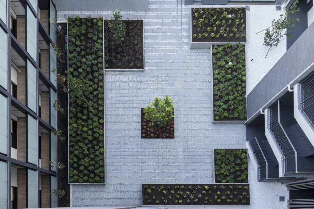 コの地形に建物を配棟し、中庭を設け居住環境の向上を図った。